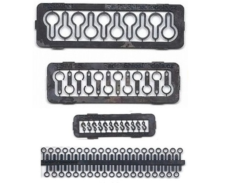 Set obsahuje objímky pro napínací kladky ze sady pro pevné lanoví, dále očka a háčky pro úvaz a upevnění takeláže.