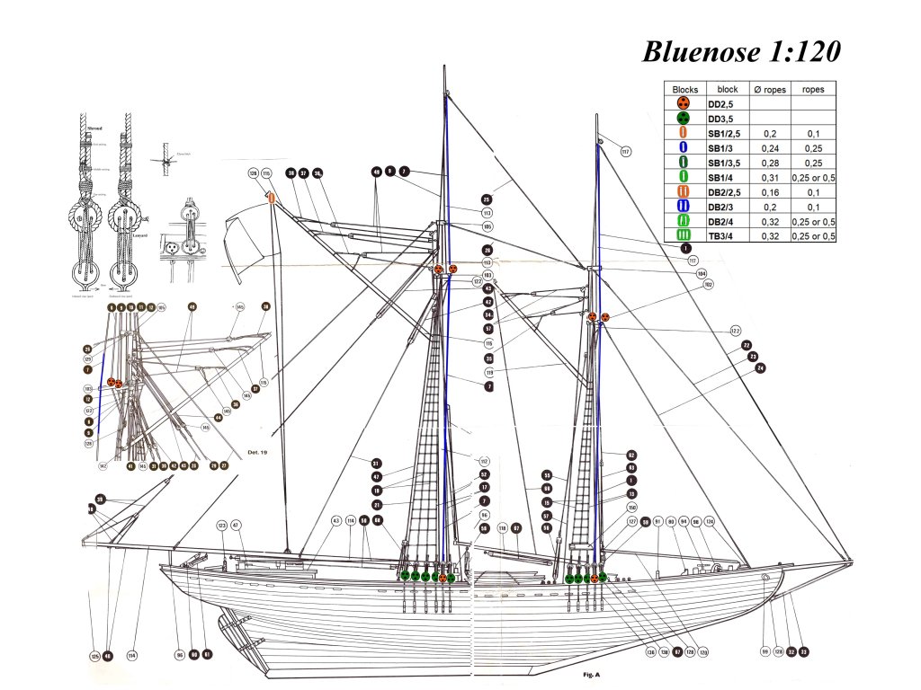 Plán Bluenose obsahuje také plány takeláže s vyznačenými kladkami.