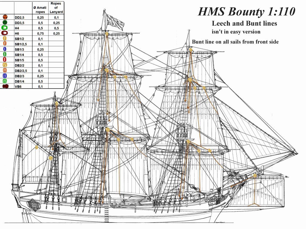 HMS Bounty plans with recommended blocks marked. This plan has 7 pages. One for standing rigging, 6 for running rigging! And one belaying plans.