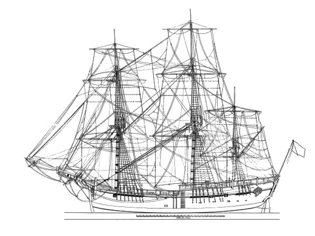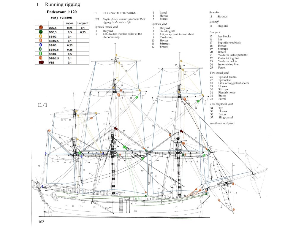 Endeavour 1:120 plans with recommended pulleys marked. Plan is attached and include a blocks for main ropes of model