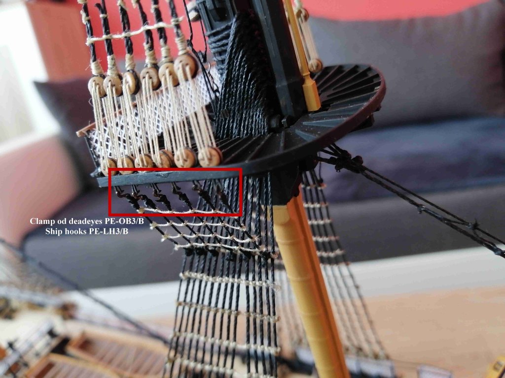 For example, hooks are used to hold tensioning hoists at the deck or on the support benches. 32 hooks are required to attach Futtock Shrouds.
