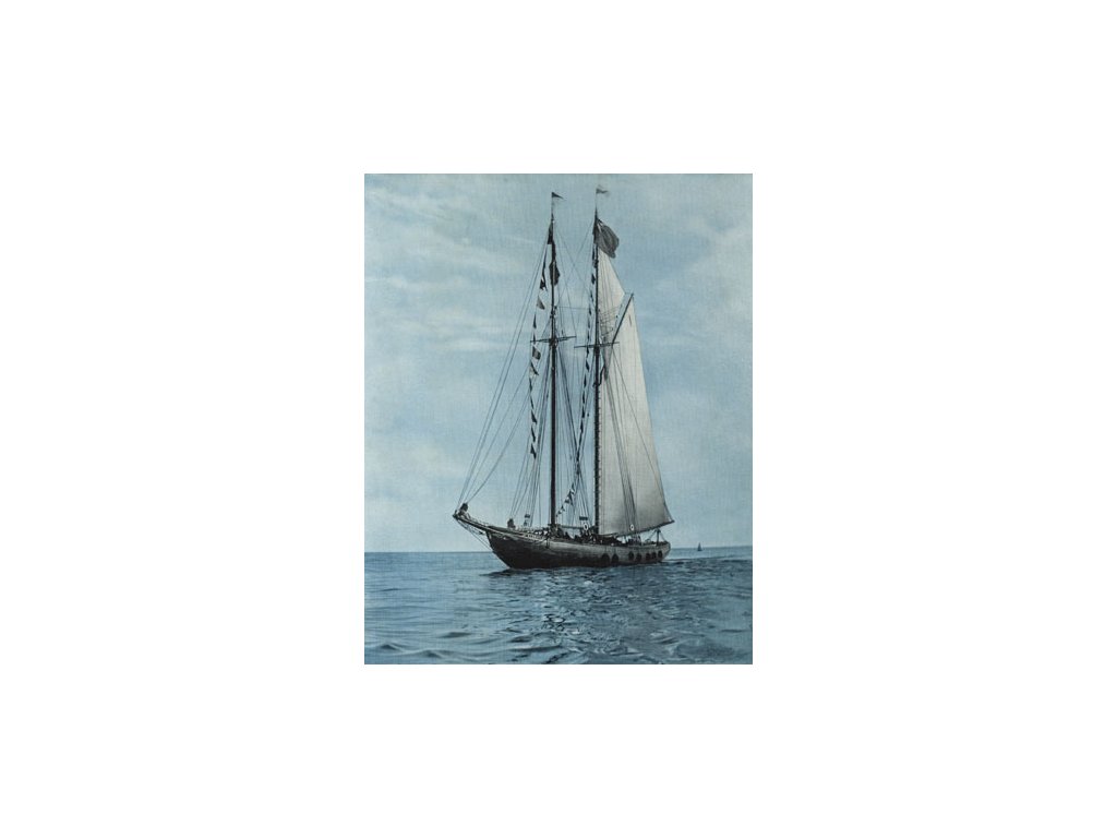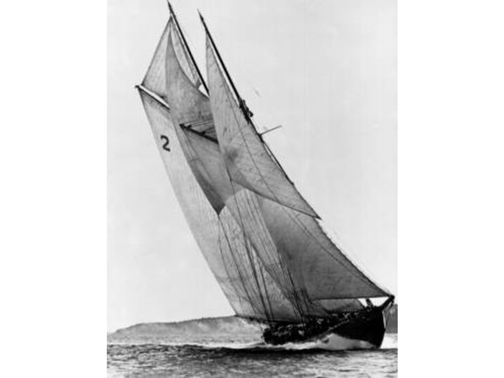 Bluenose is one of the famous naval yachts that was launched on March 26, 1921 in Nova Scotia. Her design was by William Roué. She was intended as a racing and fishing yacht. She eventually won the International Fishermen's Trophy, a prestigious race in the Grand Banks fishing region. She was then able to defend this trophy for the next 17 years. Importantly, she was not just a racing yacht, but a fishing yacht, catching scallops and other fish. After II. World War II, these yachts became obsolete and she was sold to the West Indies. Here she was eventually wrecked on 28 January 1946. Her yachting success and fame eventually brought about the depiction of this ship on the postage stamp and on the Canadian dime. A replica of this yacht was later built.