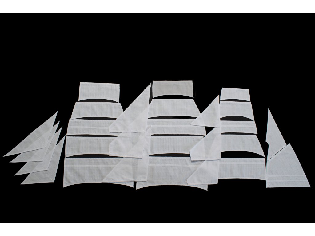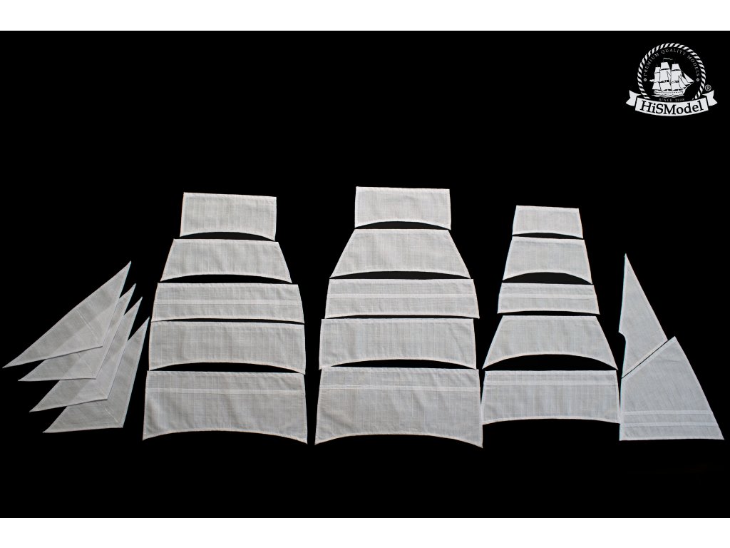 Description of sails: Set of sail is complete, as included in a real ship. Sails are sewn on CNC sewing machine, hand cut and finished. Studding sails are not included, these coudl be ordered under catalogue number S084S.