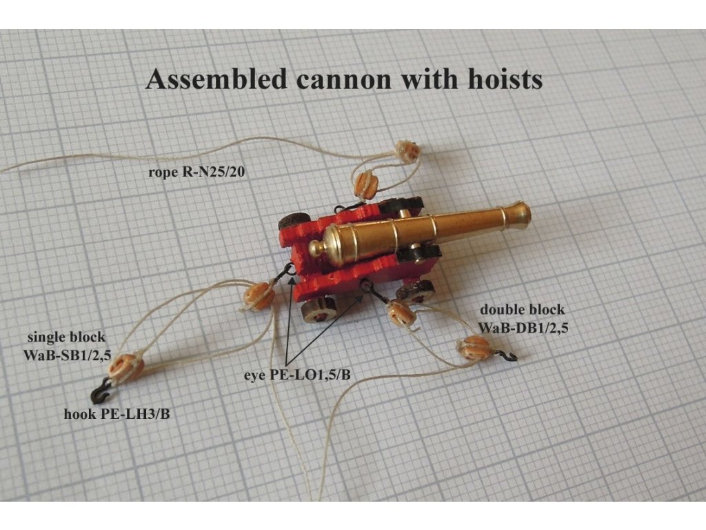 Each gun has three hoists - two on the sides of the gun carriage (to move the halyard into firing position), one more hoist at the rear of the gun carriage (moving backwards to reload). The rear hoist was only on the gun carriage when the ship was in fighting position. The hoists were hooked into the bort and on the sides of the gun carriage and in the lug on the deck of the ship behind the gun carriage. Plus, the lugs for the Breeching rope. Total of 6 hooks PE-LH3/B and 8 eyelets PE-LO1,5/B