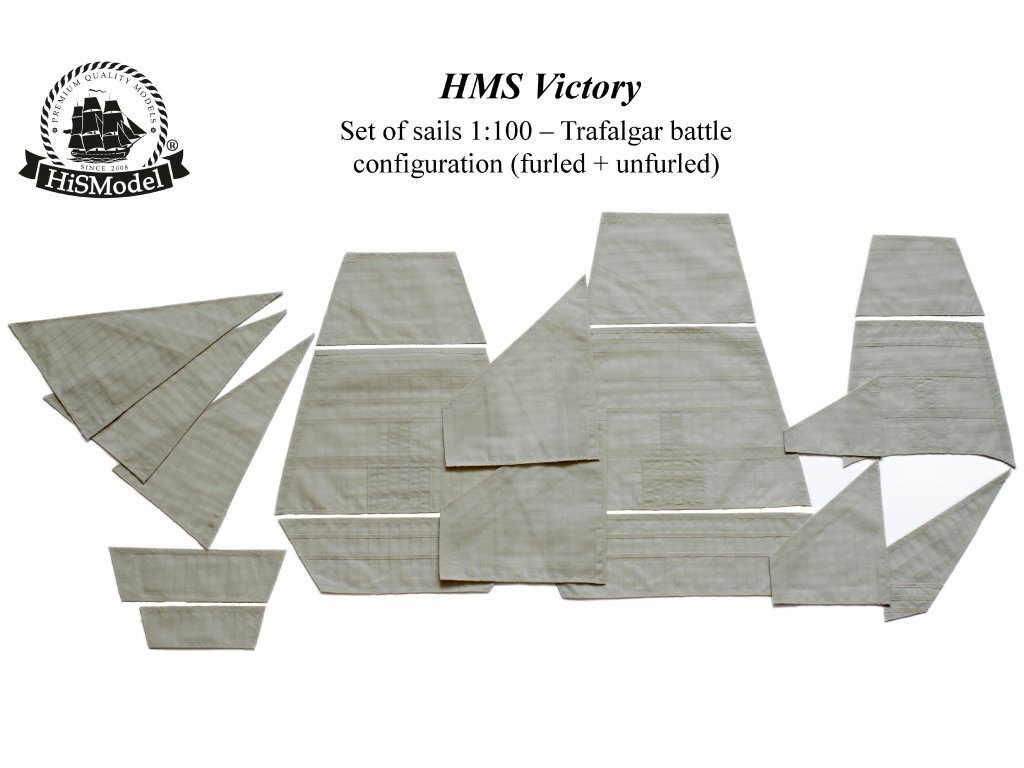 HMS Victory - set of sails by Trafalgar: This set of sails includes the sails of HMS Victory at the time of the Battle of Trafalgar. There was light wind at the time and the ship was on a tailwind. Therefore, the sails on sprit, staysails and spanker were furled, because these sails were little use in that situation. The mainsails on the fore and mainmast were also furled - for safety reasons, so that they would not be caught by the flames of the firing guns.