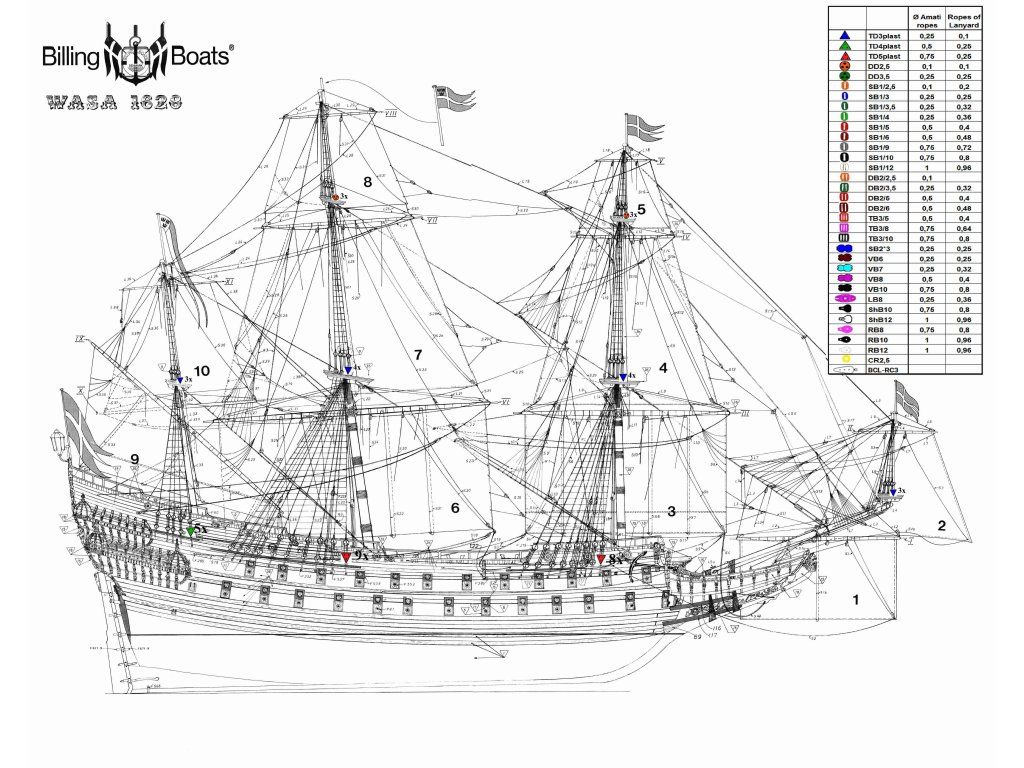 Original rigging plans with recommended blocks can be found here: Vasa Rigging Plans.