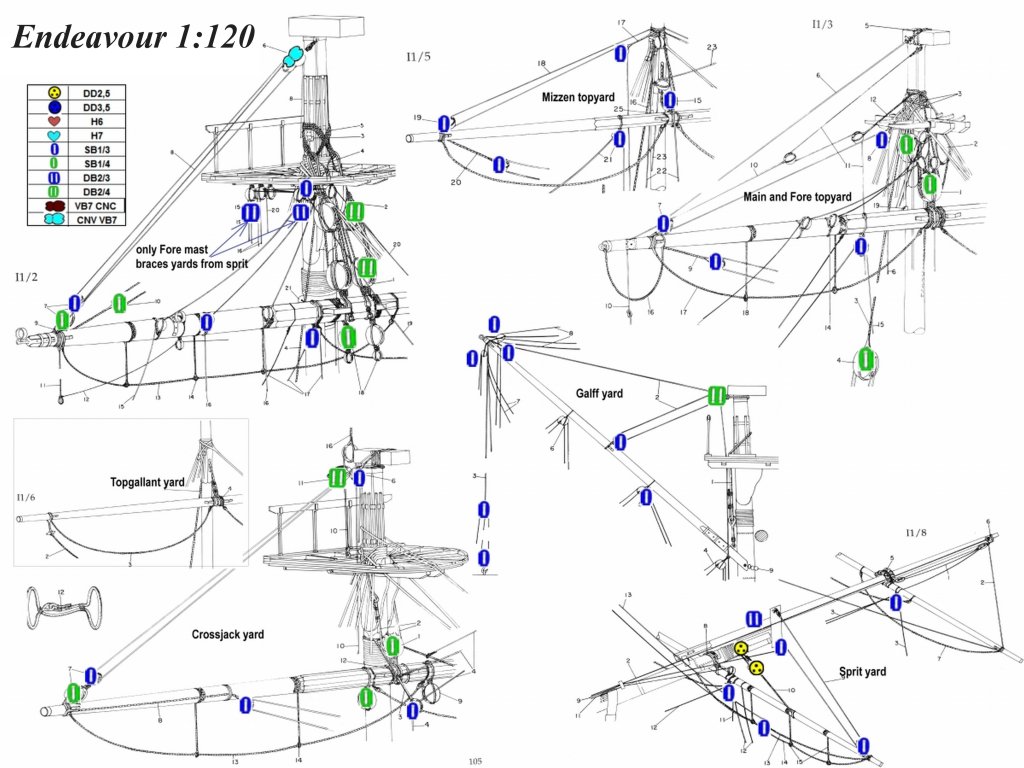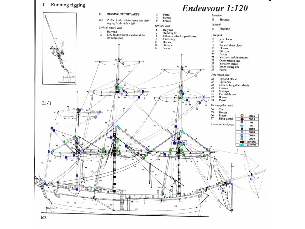 Plány Endeavour 1:120 s vyznačenými doporučenými kladkami. Tento plán má 3 strany. Jednu pro Standing rigging, 2 pro Running rigging !