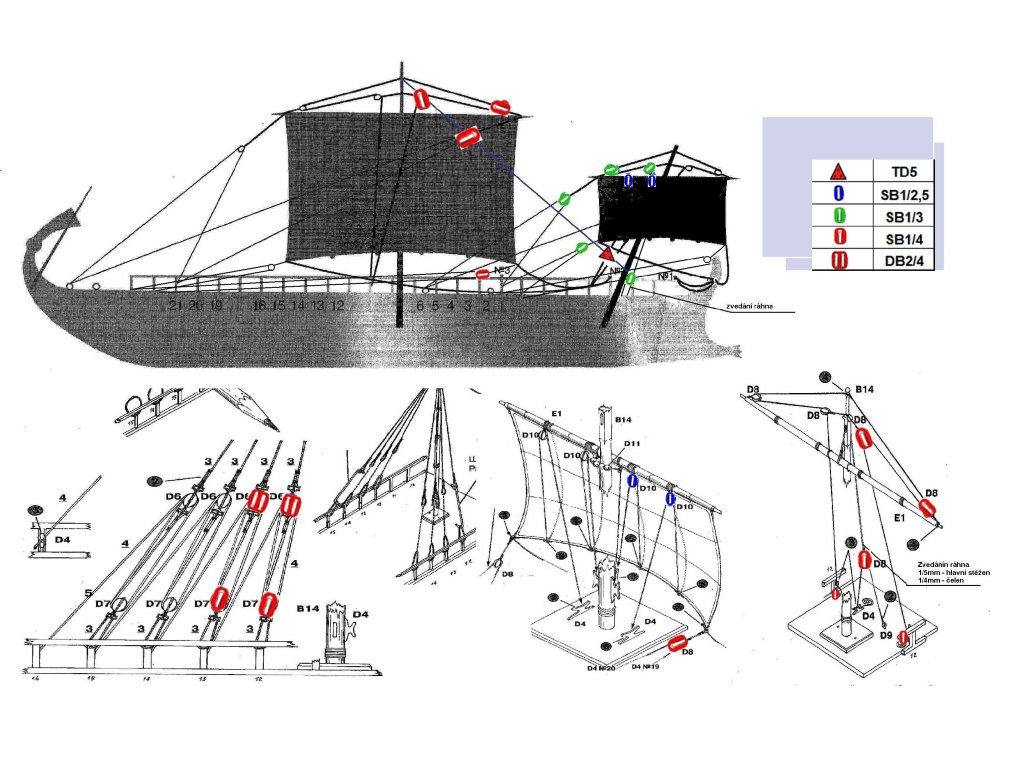 Plány Roman Warship obsahují také vyznačené kladky k lanoví.