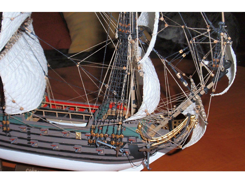 K fotkám stavebnice přidávám fota modelu, jak jej skvěle zpracoval kamarád Petr. Je vidět jak výborně udělané dřevěné kladky a pěkně ušité plachty zvednou úroveň modelu.