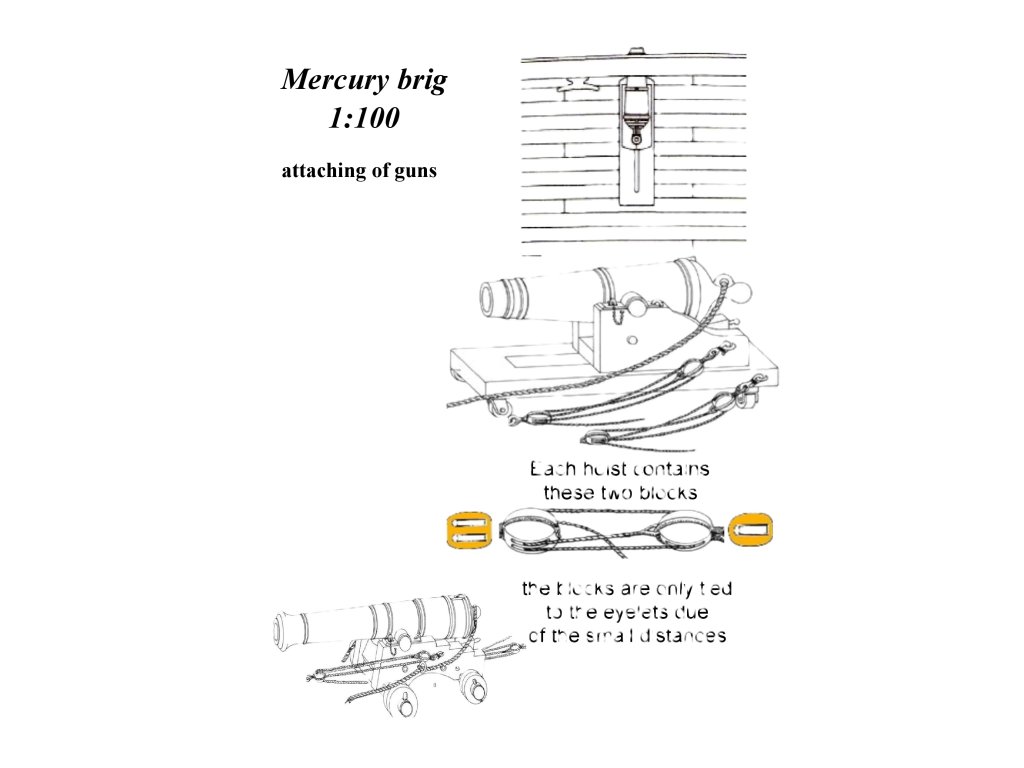Sada je určena pro 18 carronades a 2 děla na palubě lodi. Každé carronade má dva kladkostroje pro otočení do strany a zádržné lano zatažení do palebné pozice. Přední děla měla pouze tři kladostroje: dva na bocích pro vysunutí děla do palebné polohy a jeden vzadu pro zatažení děla zpět k nabití.