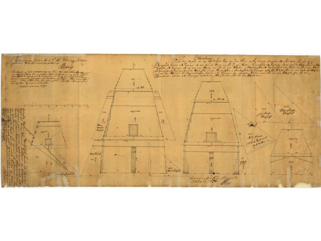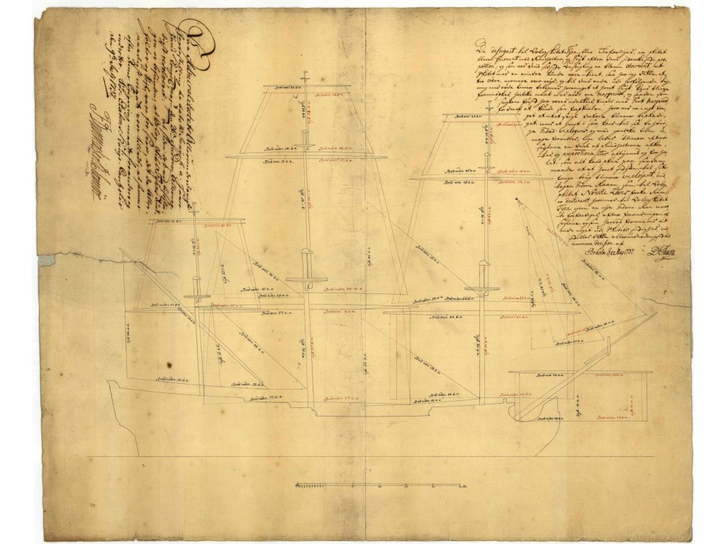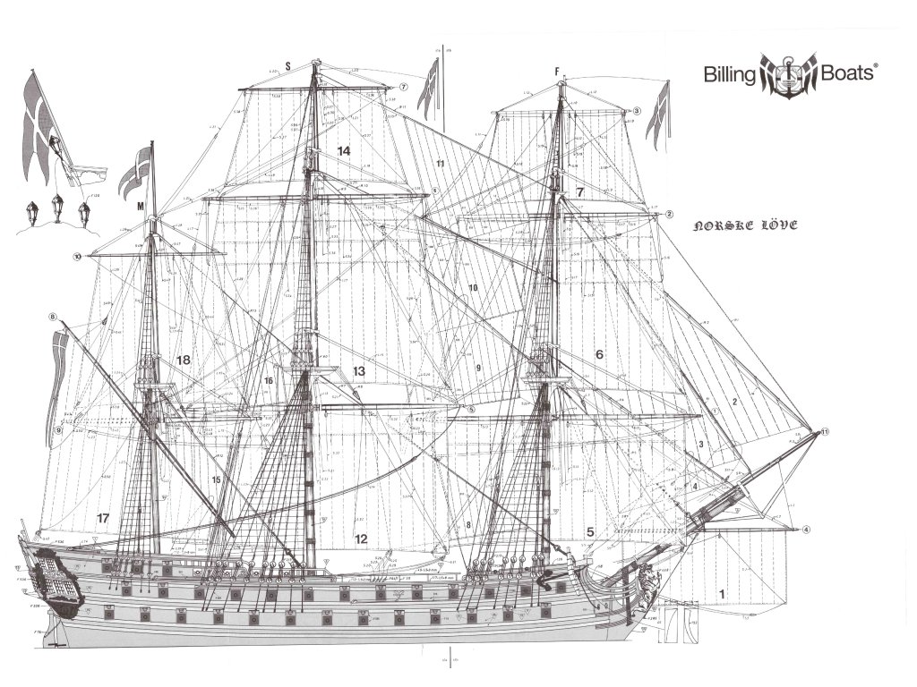 Plachty jsou ušity podle zvyklostí kontinentálního námořnictva, především Francouzských a Holandských plachet z období 17 a 18 st., odud Dánové čerpali zkušenosti při stavbě lodí. Předlohu jsem čerpal z dokumentů z Dánského Námořního Musea, které jsou přiloženy. Na rozdíl od Anglických plachet, měly plachty šité podle Kontinentálních předpisů veškeré zpevnění i refovací pásy zezadu.