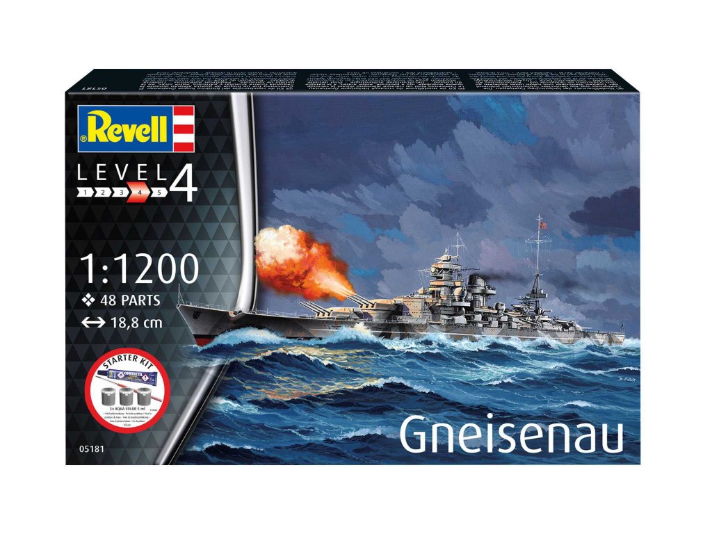 Model lodě ke slepení. Velikost: 1:1200; 18,8 cm. Balení obsahuje: 48 dílků ke slepení, lepidlo, štětec a barvičky.Ten pravý projekt pro každého, kdo si chce postavit detailní model bez starostí se sbíráním jednotlivých dílů: Startovací sada Battleship Gneisenau vám nabízí nejen působivě navržený model, ale také veškeré potřebné příslušenství - od barev a lepidla až po štětce. Ušetříte si tak spoustu bádání a můžete se rovnou pustit do stavby. Stavebnice v sobě v ideální rovnováze spojuje historii, techniku a řemeslnou zábavu - je ideální pro začátečníky nebo jako úspěšný víkendový projekt.